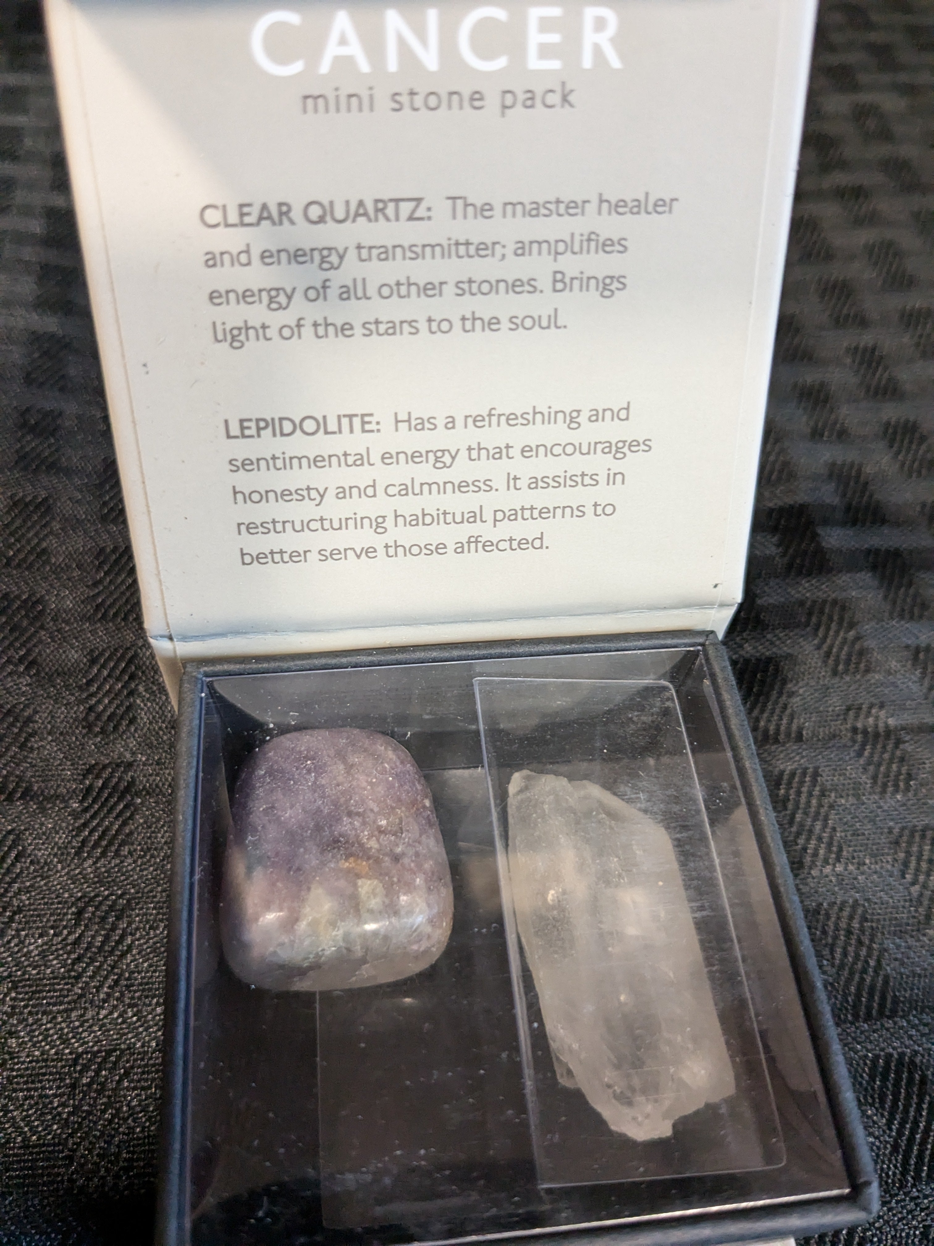 mini stone pack for the Cancer zodiac sign, includes clear quartz and lepidolite gemstones. Click on the image to read their energy properties that can invigorate your daily life.